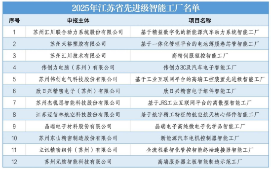 近日,江蘇省工信廳公示了,2025年江蘇省先進級智能工廠名單,吳中區12家企業成功入選,創歷史新高。