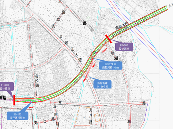(二)根據現有方案,本次擬新建道路采用雙向六車道,路幅寬度約44.5米,本項目起點為高墊大橋引橋西側臨湖路交叉口,向西跨過現狀通墅河后與吳淞江大道平交,再向西與潦涇路平交后,與終點尹南路相銜接。項目主要建設內容有:道路工程、橋涵工程、交安工程、管線工程、綠化工程、照明工程、監控工程及附屬工程等組成。
