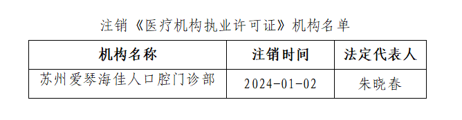 根據《醫(yī)療機構管理條例》及《醫(yī)療機構管理條例實施細則》等規(guī)定,我委受理并審核了蘇州愛琴海佳人口腔門診部注銷《醫(yī)療機構執(zhí)業(yè)許可證》的申請,并對其《醫(yī)療機構執(zhí)業(yè)許可證》予以注銷,并已予公示,特此告知。