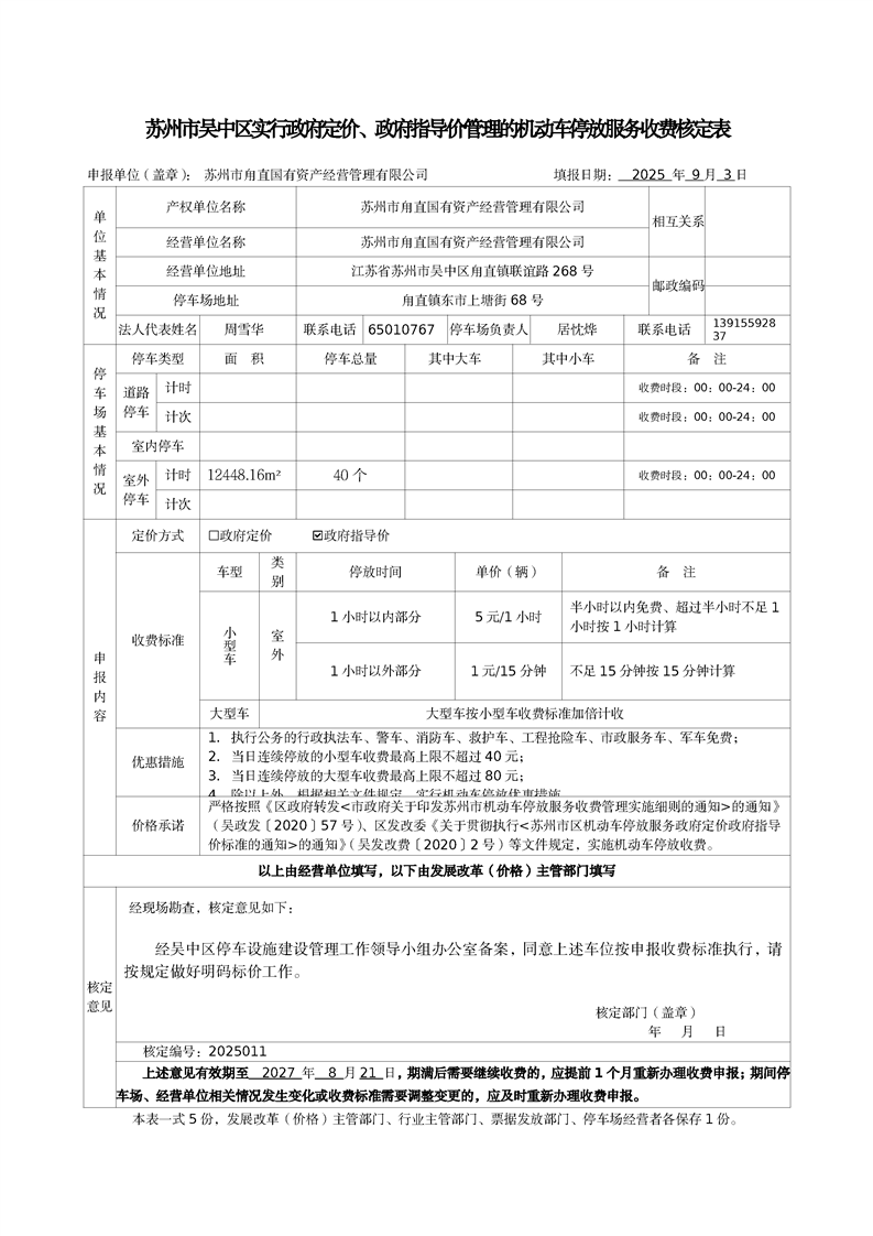 機動車停放服務收費核定表(2025011)(國資公司甪端停車場)