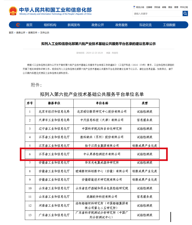 近日,擬列入工業(yè)和信息化部第六批產(chǎn)業(yè)技術(shù)基礎(chǔ)公共服務(wù)平臺名錄的建議名單公示,江蘇省共3家單位入選,其中吳中區(qū)的中認英泰檢測技術(shù)有限公司成功入選試驗檢測類公共服務(wù)平臺。