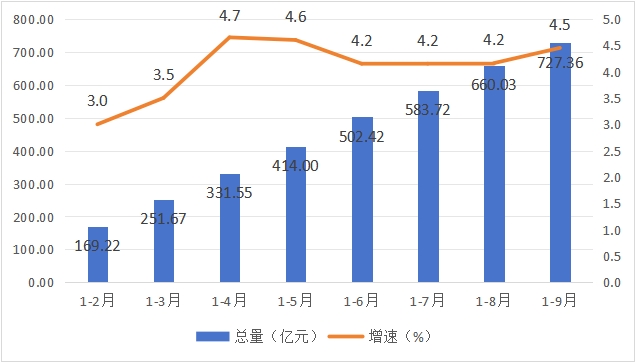表1:1-9月吳中區社會消費品零售總額及同比增速