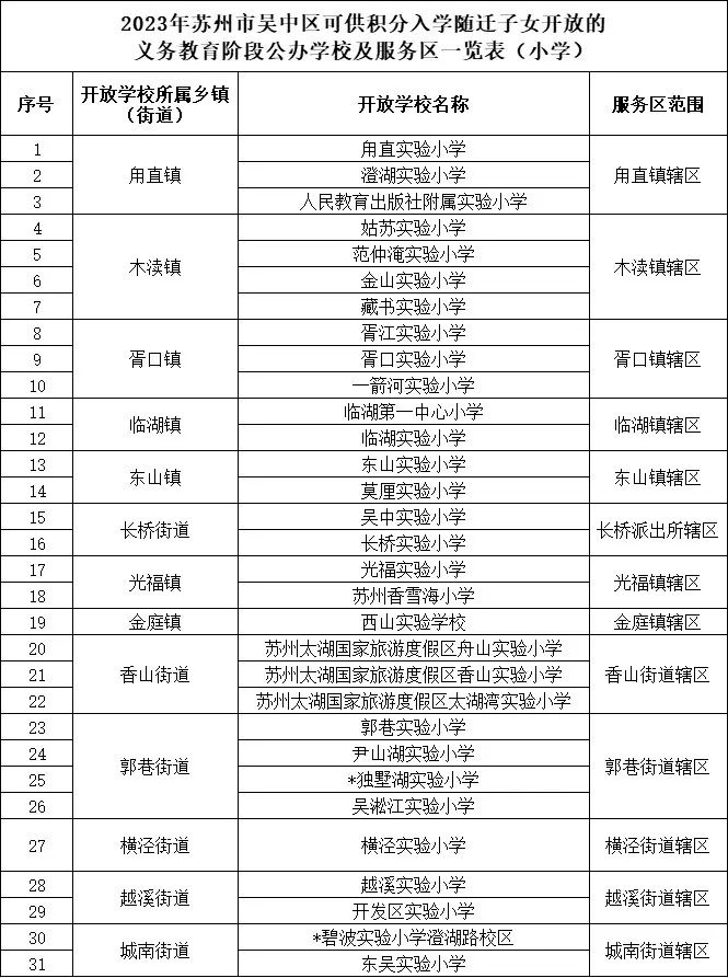 2023年蘇州市吳中區可供積分入學隨遷子女開放的義務教育階段公辦學校及服務區一覽表(小學)