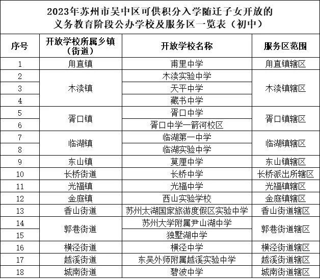 2023年蘇州市吳中區可供積分入學隨遷子女開放的義務教育階段公辦學校及服務區一覽表(初中)