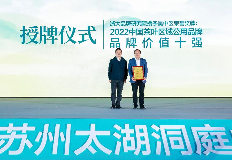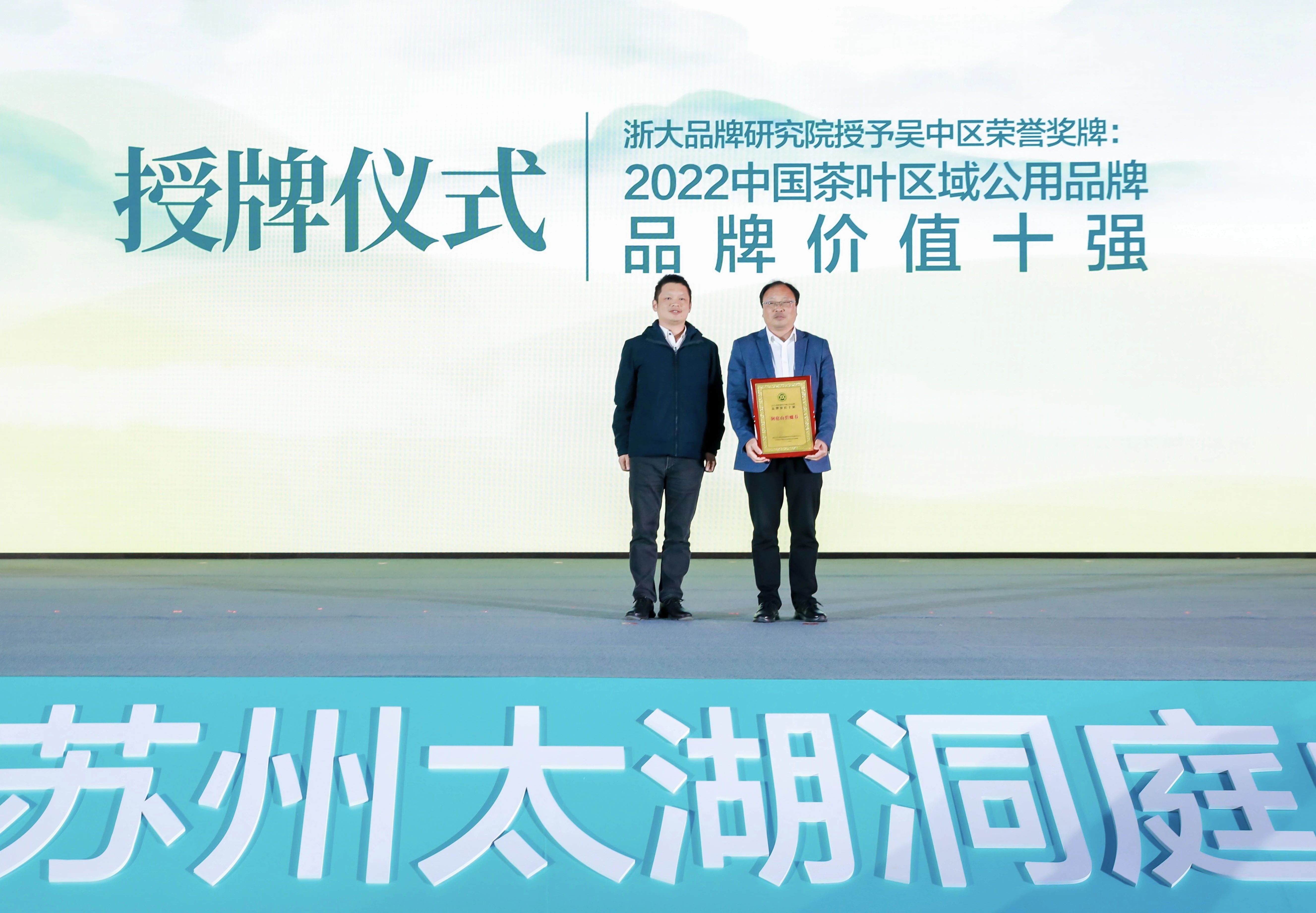 授予洞庭山碧螺春茶“2022中國茶葉區(qū)域公共品牌價值十強(qiáng)”榮譽(yù)獎牌。
